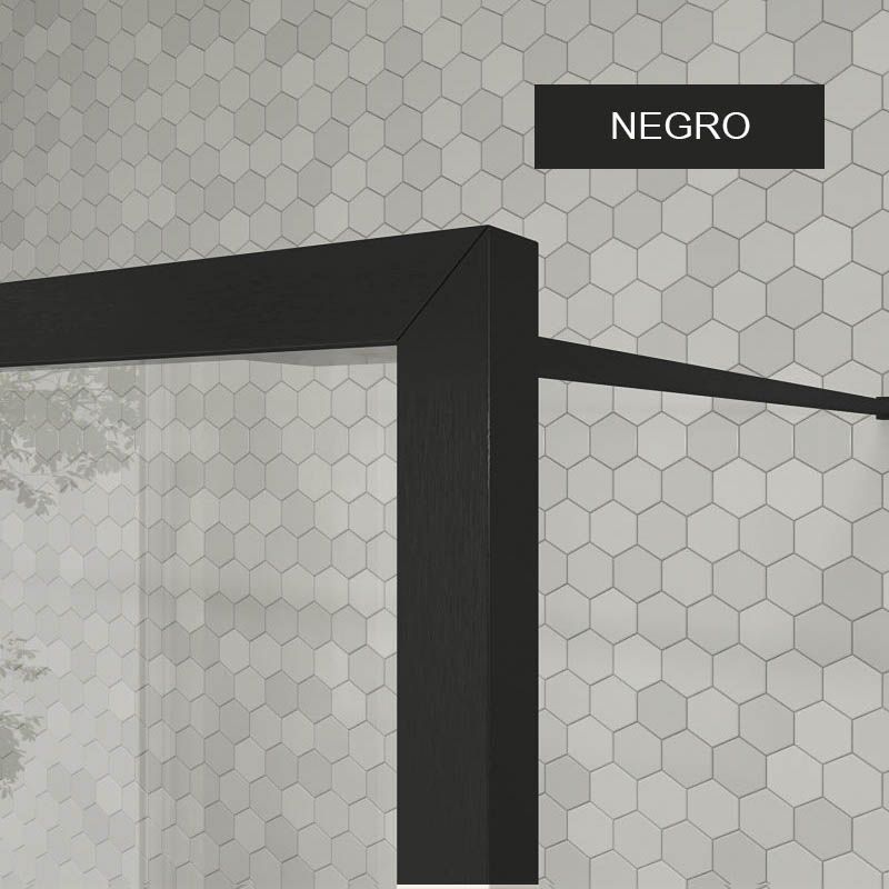 Su preciosa perfilería minimalista de tan solo 2 cm (perfil a pared y brazo de sujeción extensible) ofrece un detalle único y elegante a una mampara de una única hoja de cristal incoloro de 4 mm . con tratamiento anti-cal incluido.