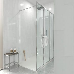 Su preciosa perfilería minimalista de tan solo 2 cm (perfil a pared y brazo de sujeción extensible) ofrece un detalle único y elegante a una mampara de una única hoja de cristal incoloro de 4 mm . con tratamiento anti-cal incluido.