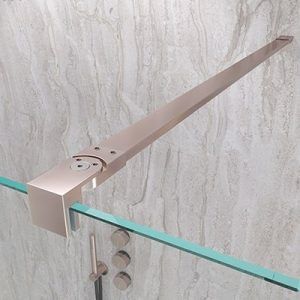 El brazo extensible a pared en acero oro-rosa se ajustará a tu espacio de ducha y aportará un plus de estabilidad. ¡Verás como el cristal no se mueve ni vibra y queda perfecto en tu aseo!