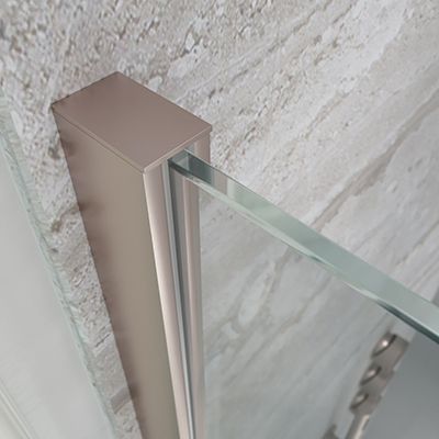 Su preciosa perfilería de aspecto cobrizo (perfil a pared y brazo de sujeción extensible) ofrece un detalle único y elegante a una mampara de una única hoja de cristal incoloro de 8 mm. con tratamiento anti-cal incluido.