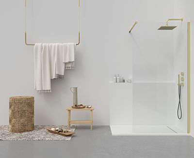 - Escoge una bonita grifería de ducha en forma de columna del mismo acabado oro o bien, negro mate. Ambos tonos combinarán genial con tu mampara de ducha ZEN oro.