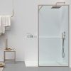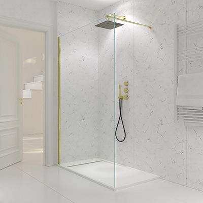 Su preciosa perfilería de aspecto dorado (perfil a pared y brazo de sujeción extensible) ofrece un detalle único y elegante a una mampara de una única hoja de cristal incoloro de 8 mm. con tratamiento anti-cal incluido.