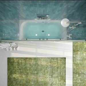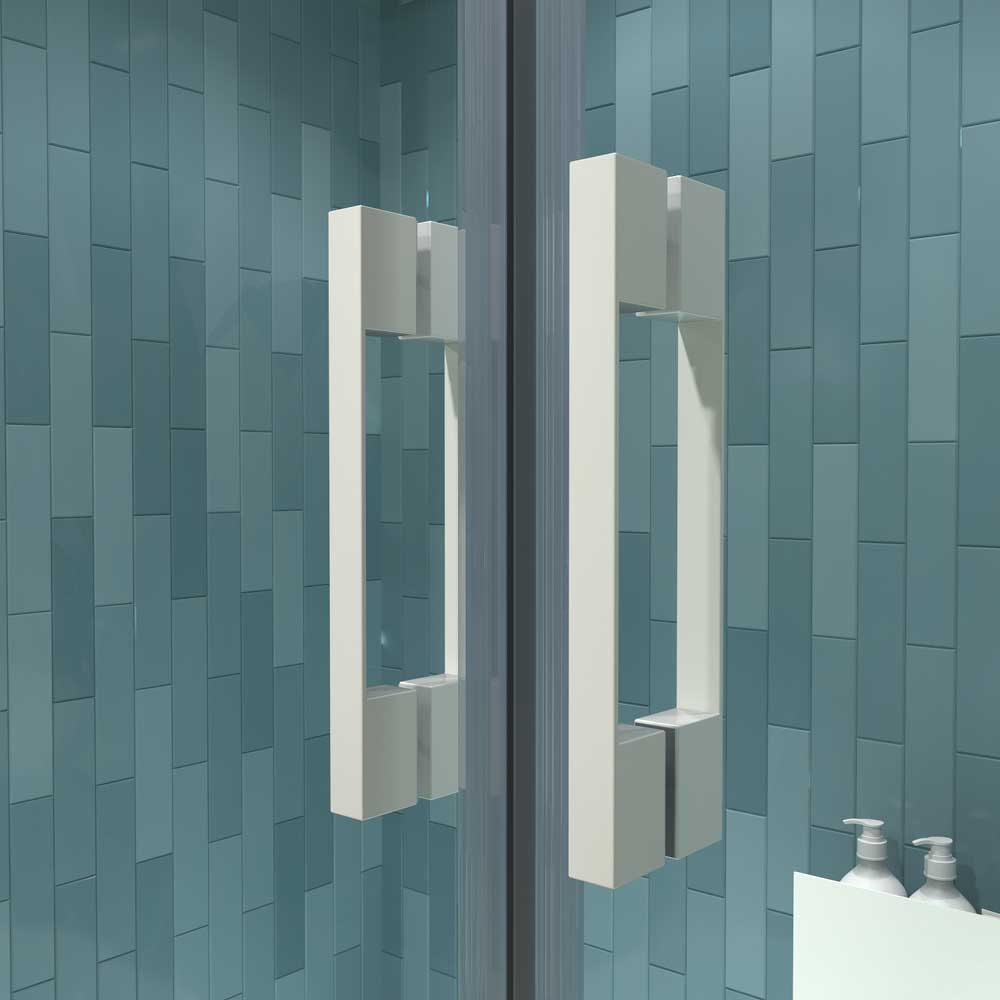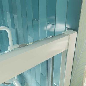 Mampara sin perfil inferior pero con junta de aluminio blanco mate para asegurar la estanqueidad.