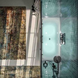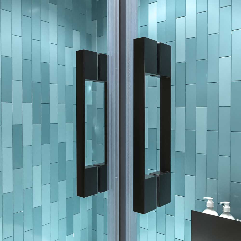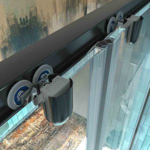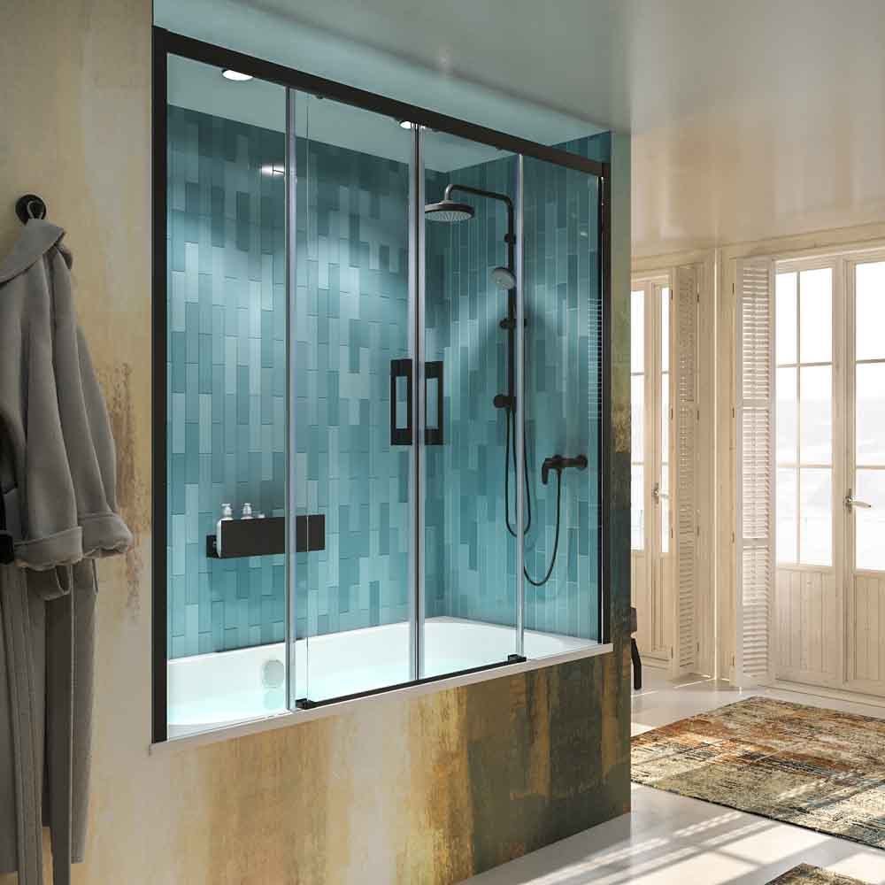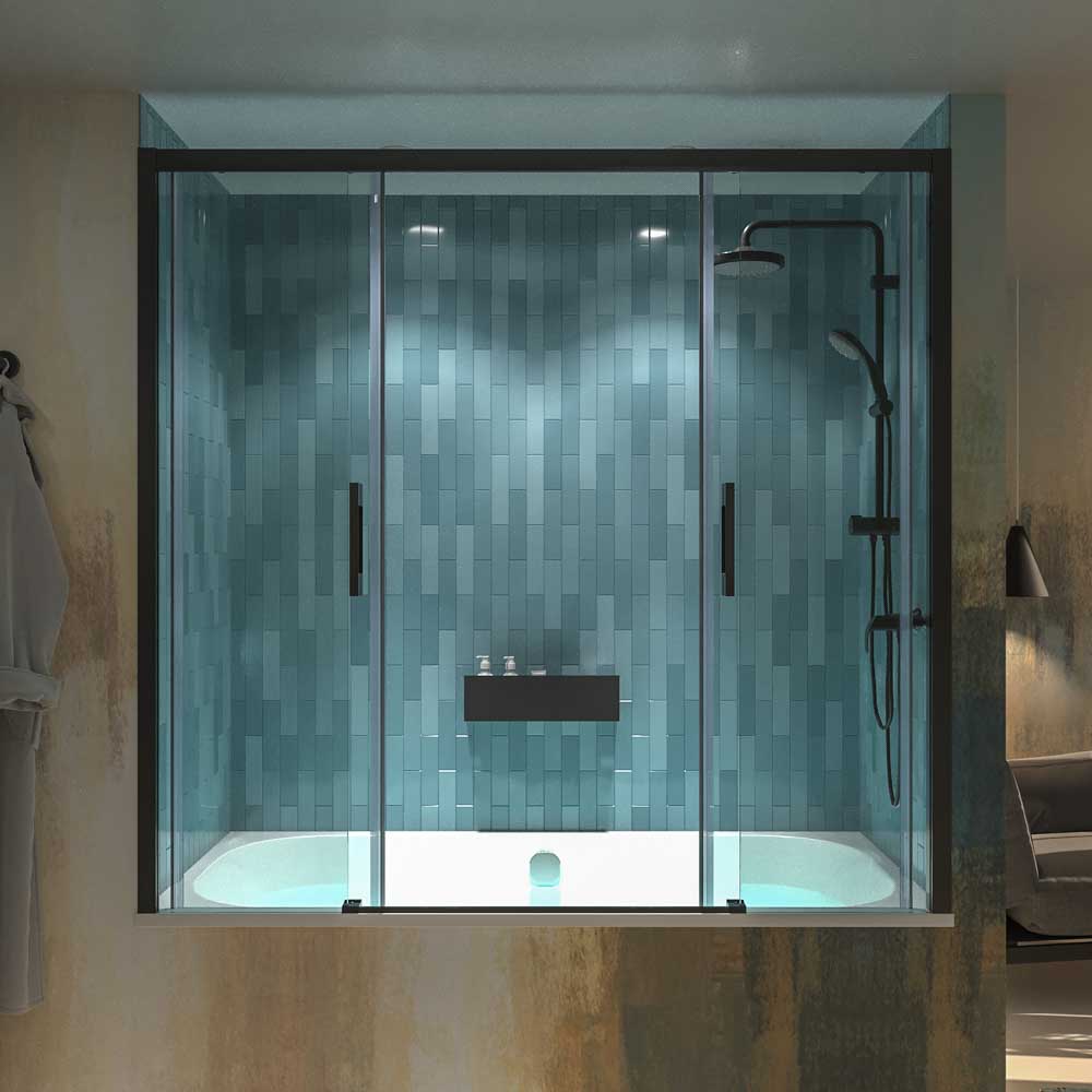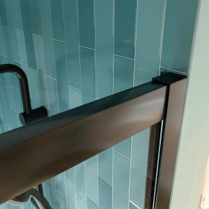 Mampara sin perfil inferior pero con junta de aluminio negro mate para asegurar la estanqueidad.