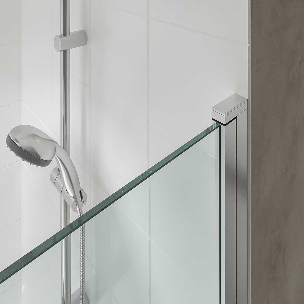 Este biombo de bañera abatible 180º no tiene raíl inferior, aunque sí lleva un junquillo que asegura la estanqueidad. Otra ventaja de esta hoja de bañera de líneas rectas es su sistema antical, que protege el vidrio de los depósitos de cal y facilita su limpieza.