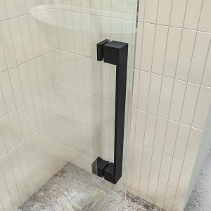 - Tirador alargado con forma rectangular, siguiendo el diseño de la mampara