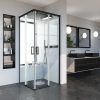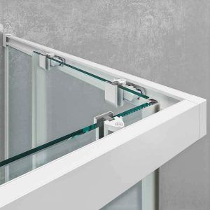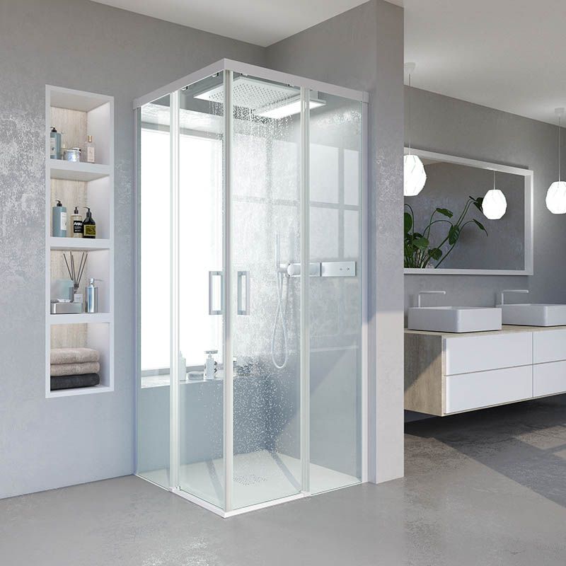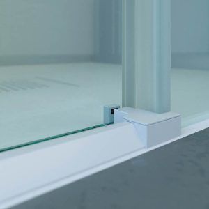 La mampara de ducha angular BASIC se compone de dos hojas fijas y dos correderas, con un acceso por el vértice y posibilidad de instalarla con apertura a izquierdas o derechas. Esta mampara de ducha estándar se entrega en 2-3 días y está disponible en un amplio rango de medidas: de 68-100 a 68-100 cm por lado.
