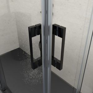 Sé el primero en valorar “Mampara de ducha cuadrada FLARE apertura angular 2 fijos-2 puertas correderas. Sin perfil inferior. Con tratamiento anti-cal. Acabado NEGRO MATE”