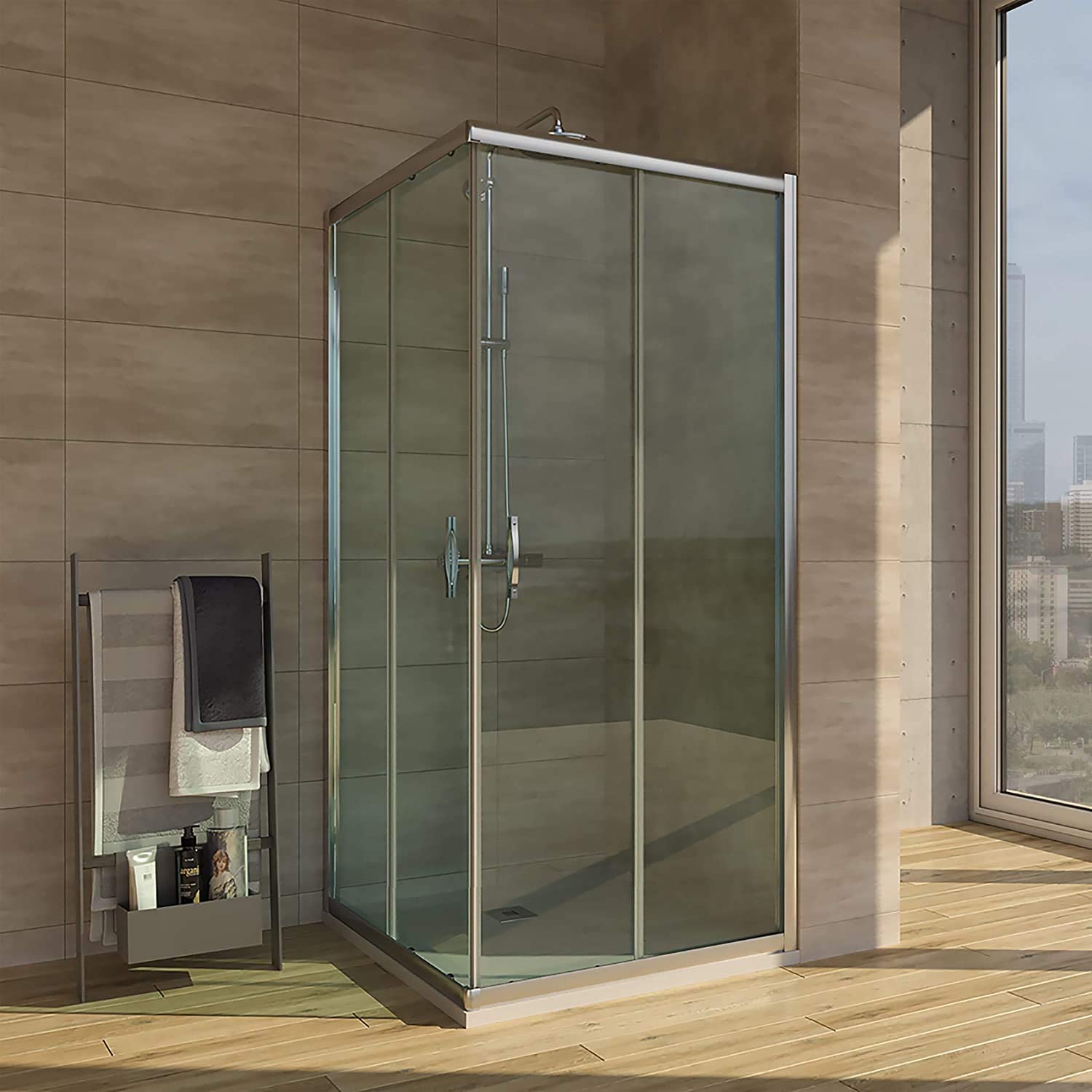 Su vidrio templado tiene 6 mm de grosor y acabado transparente y la perfilería es de aluminio anodizado plata brillo, así como los accesorios. Al componerse de dos fijos, y dos puertas correderas, los rodamientos dobles de la mampara Tempo se desgastarán menos y el conjunto durará más como nuevo.