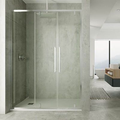 Frontal de ducha compuesto por dos hojas abatibles hacia el exterior o interior y una hoja fija . La hoja pivota sobre el eje compuesto por una pinza en la parte inferior y superior de la mampara. Este novedoso sistema garantiza una larga durabilidad de la mampara por su sencillo mecanismo. Es muy recomendado para frontales comprendidos entre 100 y 200 cm. Es conveniente asegurarse que no haya ningún impedimento al abatir la hoja hacia afuera, confirmando así que los sanitarios o el lavabo no impida abrir la hoja con total seguridad. Los perfiles son de aluminio anodizado en plata alto brillo, especialmente tratado para estar en contacto con el agua y la humedad, y el vidrio es templado de seguridad de 6mm en transparente. ¡Incluye un tratamiento anti-cal en los cristales ! Sistema de fácil limpieza. Fácil instalación.