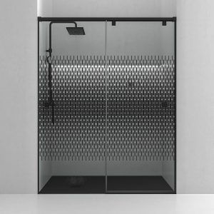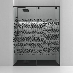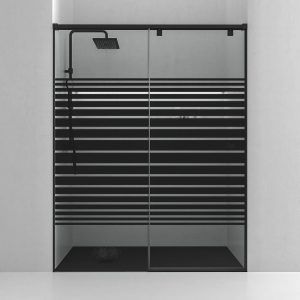 Sé el primero en valorar “Mampara de ducha frontal LIFE 1 fijo + 1 puerta corredera Serigrafiada vidrio 8 mm con cierre amortiguado. Acabado NEGRO MATE”