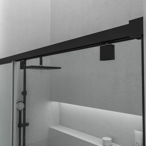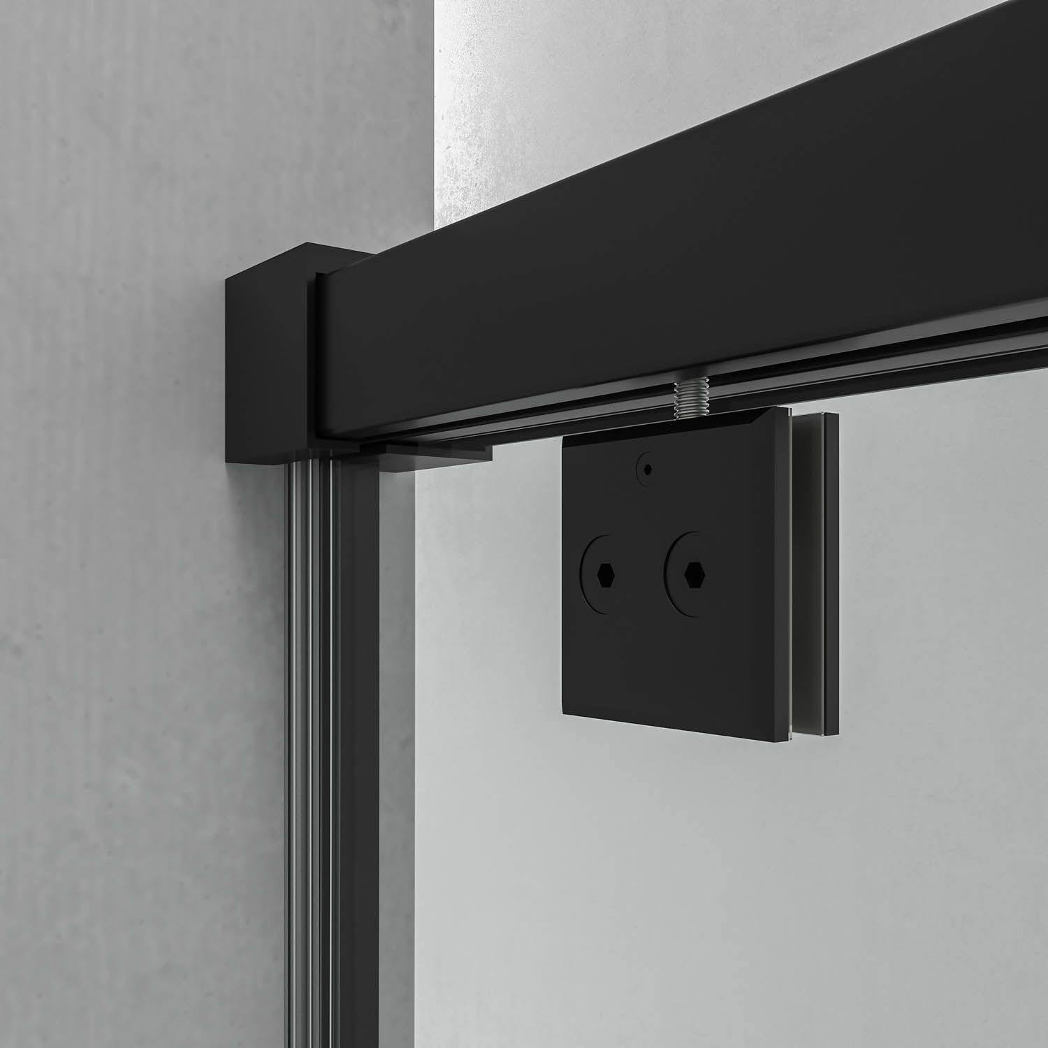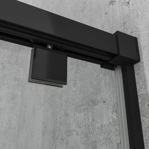 • Mampara de ducha frontal 1 fijo – 1 puerta corredera sin perfil inferior negro mate, cristal templado 8 mm de seguridad , altura 200 cm.