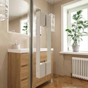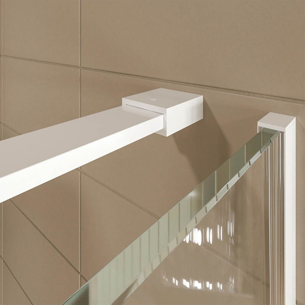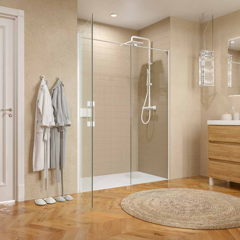 Su tirador minimalista combina con el aspecto depurado de la mampara, que incorpora un brazo de sujeción a pared para conseguir que el fijo frontal no cimbree.