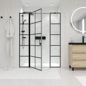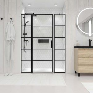 Sé el primero en valorar “Mampara de ducha frontal OPEN 2 fijos – 1 puerta abatible serigrafia industrial. Acabado NEGRO MATE” Cancelar la respuesta