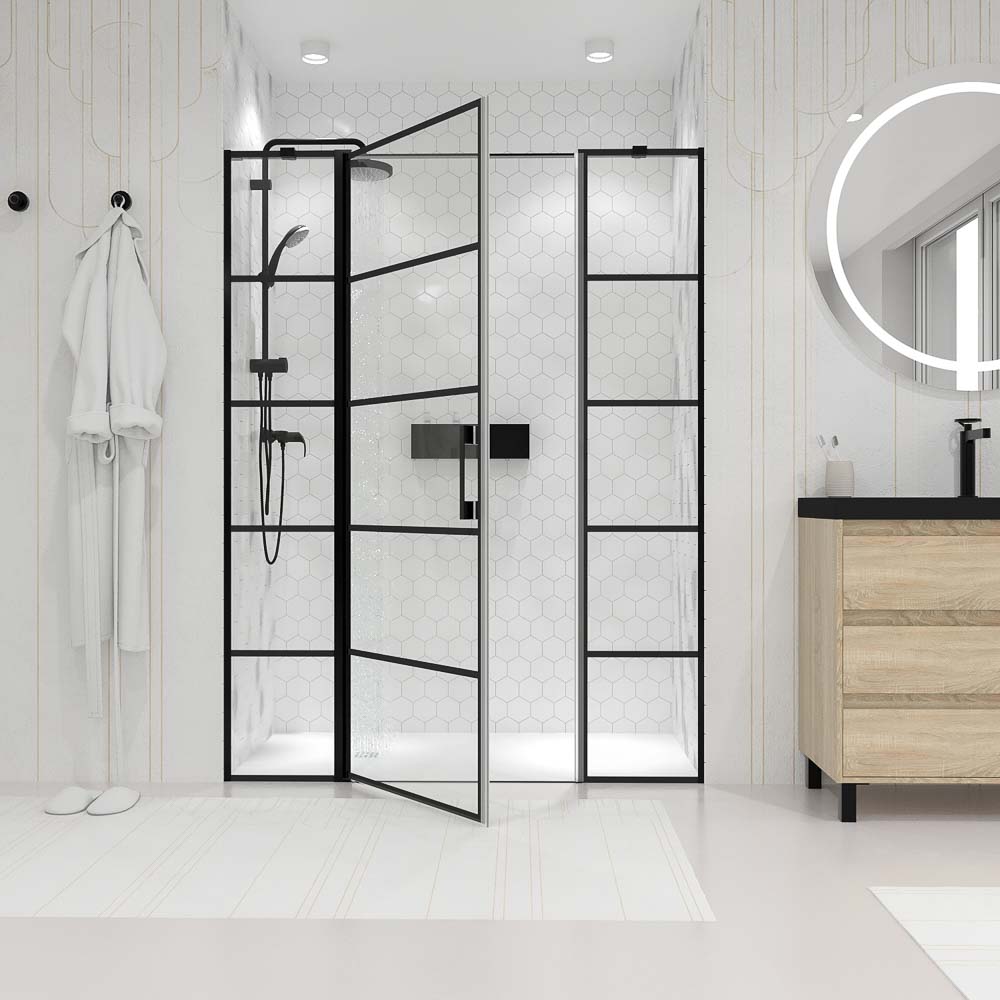 Mampara de ducha frontal OPEN 2 fijos – 1 puerta abatible serigrafia industrial. Acabado NEGRO MATE