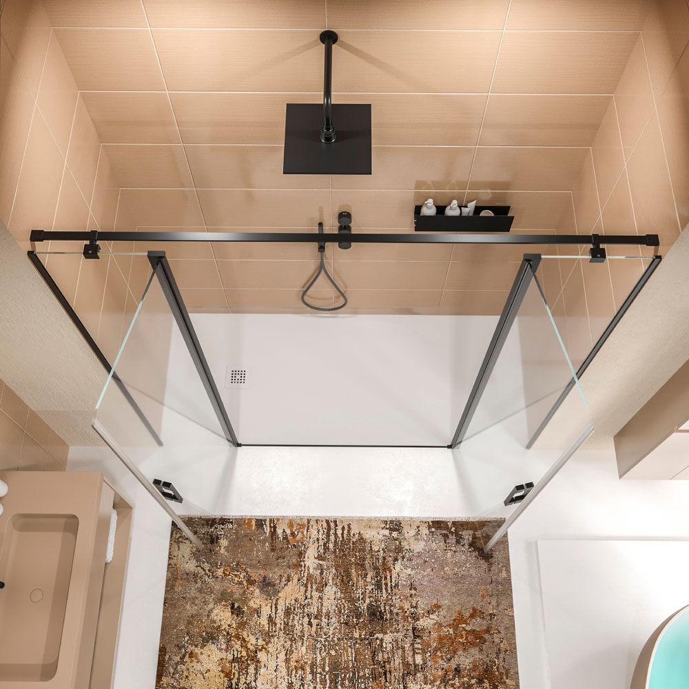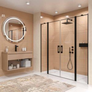 Recomendable especialmente para casos donde se quiere obtener una buena entrada a la ducha, pero se necesita poner 2 partes fijas (una en cada extremo) para evitar que la hoja toque algún elemento del baño como el inodoro o el lavabo a la hora de abrirla al exterior