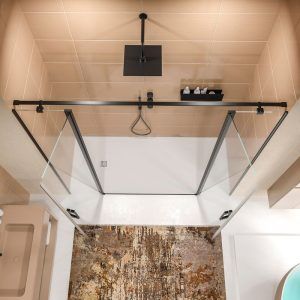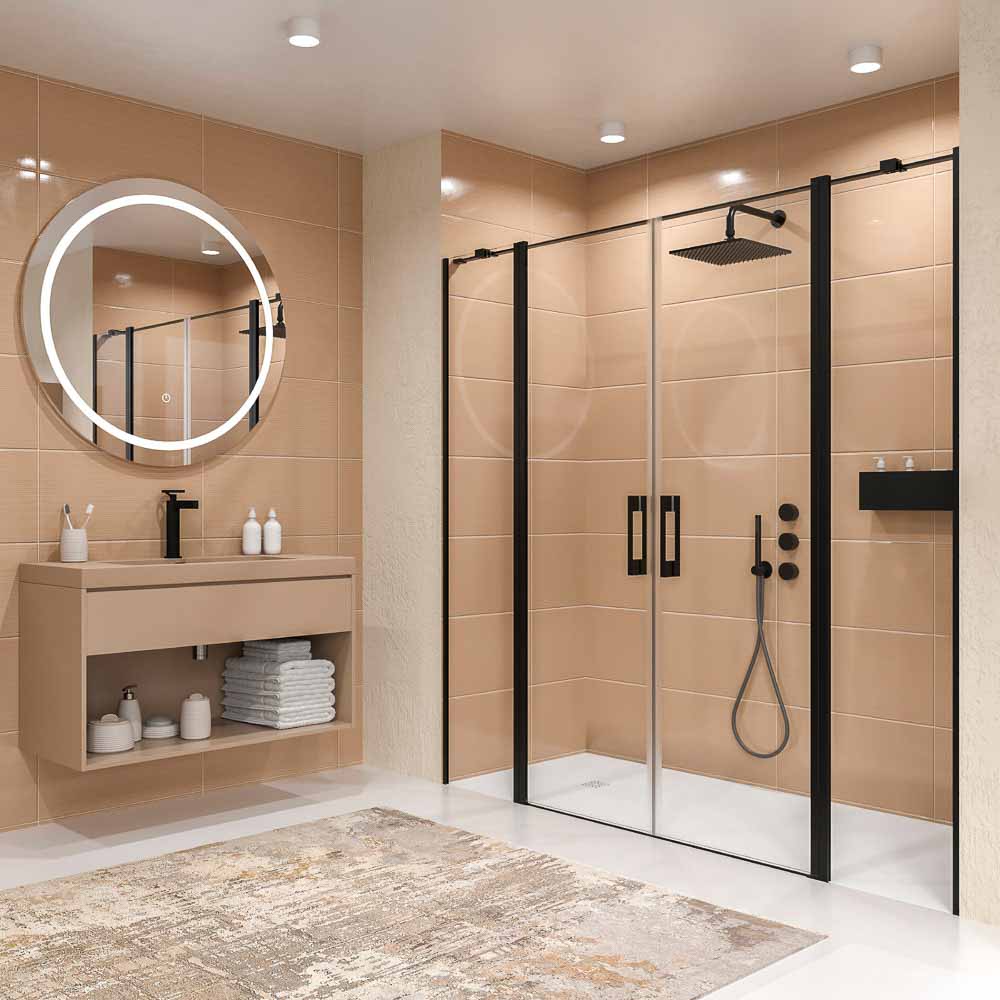 Perfilería en aluminio extrusionado anodizado negro mate, o variaciones de color ( consultar ). Perfilería diseñada en líneas rectas y alargadas. Sin perfiles ni railes inferiores, garantizando una entrada cómoda y sin escalones, ideal para personas mayores o de movilidad reducida