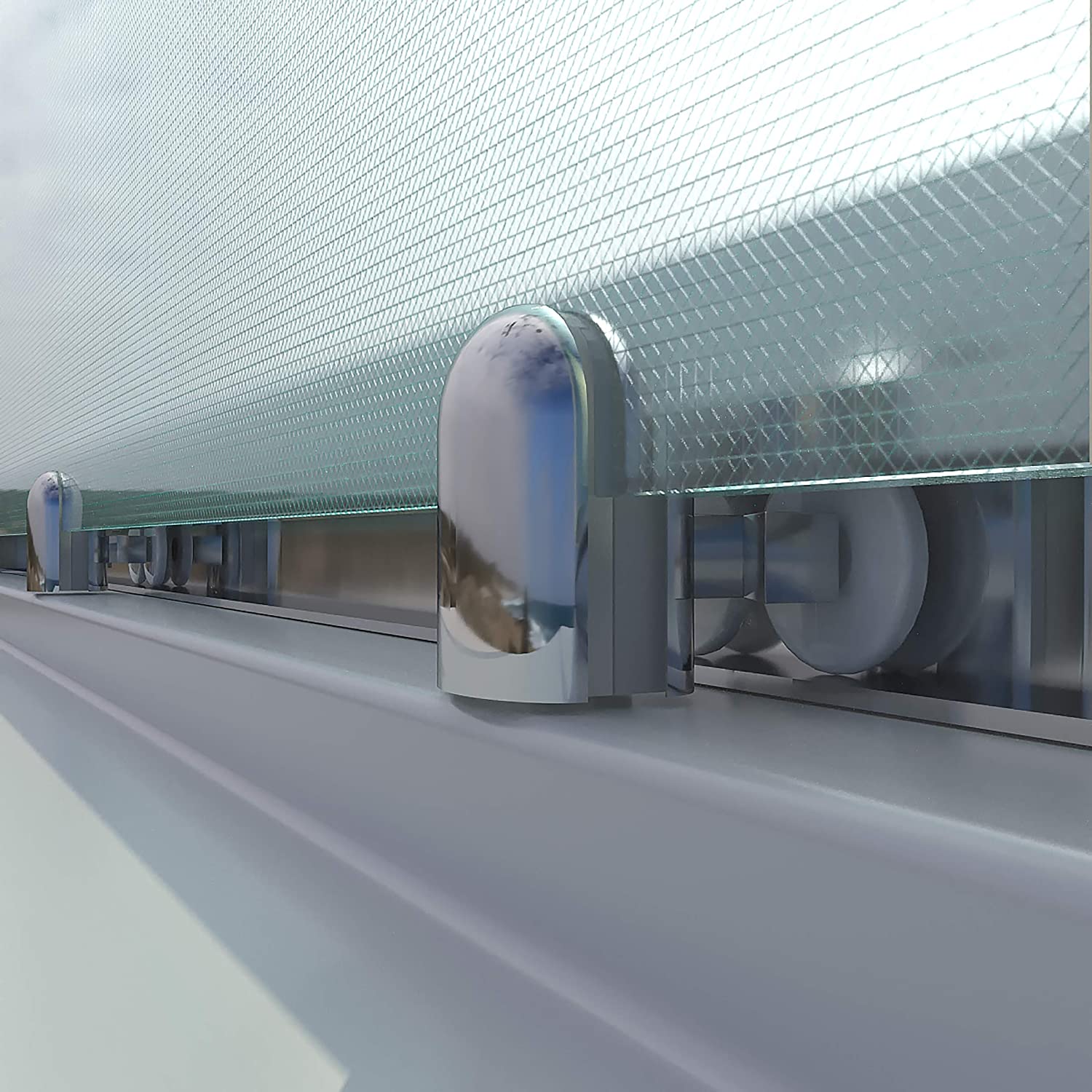Su vidrio templado tiene 6 mm de grosor y acabado newcarglass y la perfilería es de aluminio anodizado plata brillo, así como los accesorios. Al componerse de dos únicas hojas, y solo una corredera, los rodamientos dobles de la mampara Tempo se desgastarán menos y el conjunto durará más como nuevo.