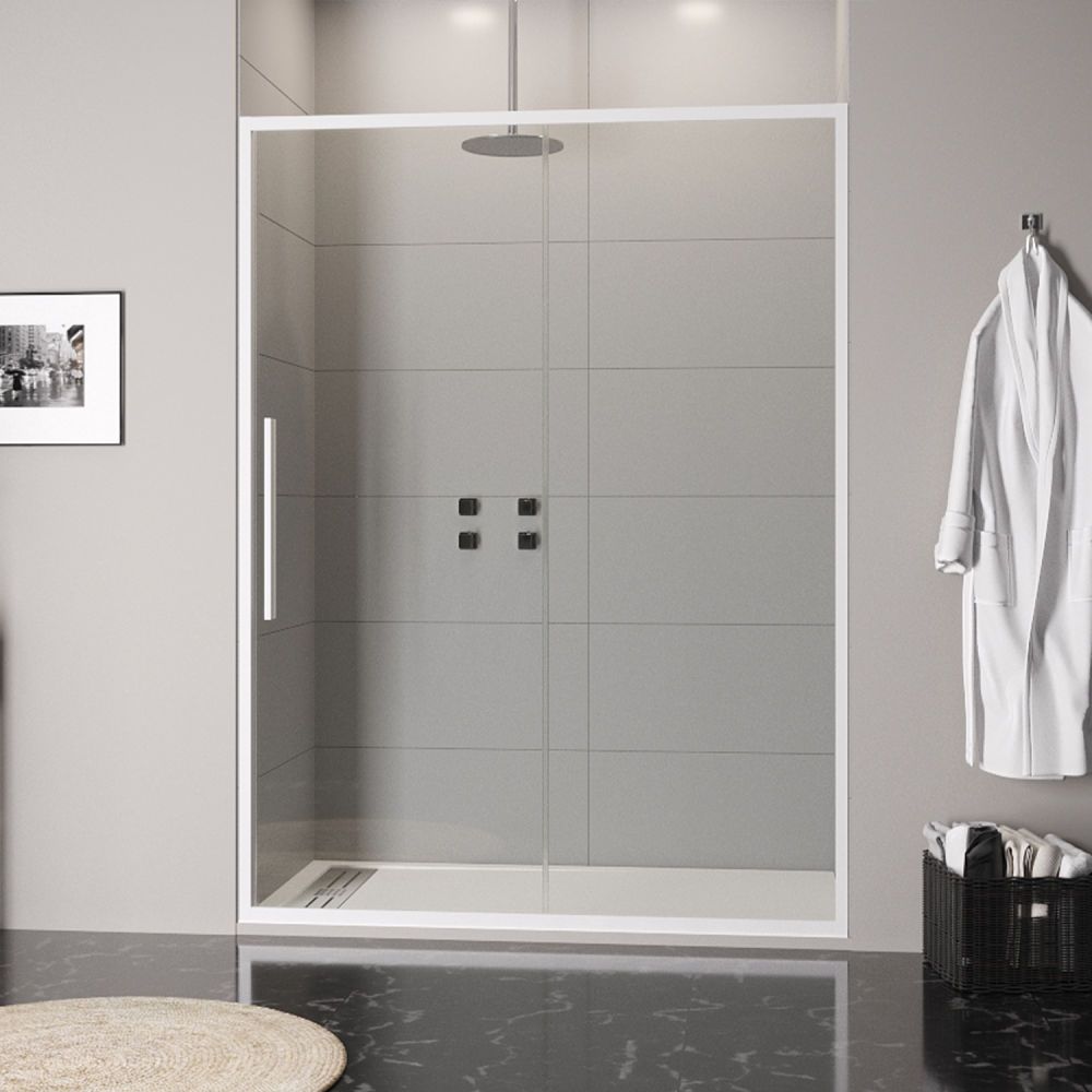 • Mampara de ducha frontal 1 fijo – 1 puerta corredera sin perfil inferior, perfil blanco mate, cristal templado 6 mm de seguridad , altura 195 cm.