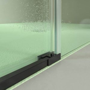 • El frontal de ducha PETRA  abarca una horquilla de medidas de ancho bien amplia (95-170 cm) y tiene una considerable altura (200 cm), lo que evita siempre fugas de agua y potencia la continuidad visual cuando los vidrios son incoloros. Los rodamientos de este modelo, también de acero, así como su tirador, regalan un deslizamiento silencioso. La hoja fija no lleva guía inferior y la corredera un perfil bajo de 1 cm simplemente para asegurar la estanqueidad y servir como guía a la puerta.