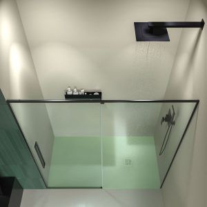 Mampara de ducha PETRA frontal 1 fijo – 1 puerta corredera vidrio 6 mm . Acero inoxidable NEGRO MATE