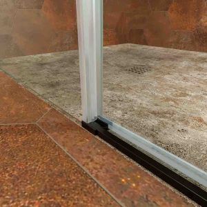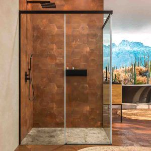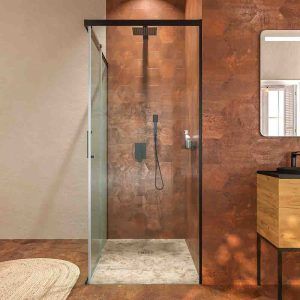 • Mampara de ducha rectangular 1 fijo- 1puerta corredera+ 1 fijo  sin perfil inferior, perfil negro mate, cristal templado 6 mm de seguridad, altura 195 cm.