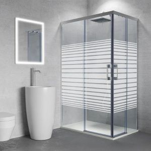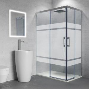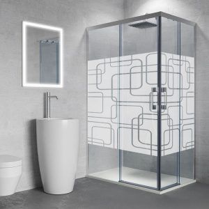 Sé el primero en valorar “Mampara de ducha rectangular FLARE apertura angular 2 fijos-2 puertas correderas SERIGRAFIADAS . Sin perfil inferior. Con tratamiento anti-cal. Acabado CROMO BRILLO”