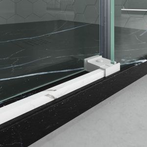 Mampara de ducha rectangular FLARE apertura angular 2 fijos-2 puertas correderas. Sin perfil inferior. Acabado efecto mármol. CALACATTA