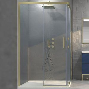 La perfilería de esta mampara de baño es de aluminio acabado Oro mate , lo que, junto a las líneas depuradas y a su tirador a juego, confiere una sensación de amplitud y luz ante la que es imposible resistirse.