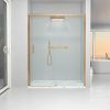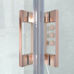 La perfilería de esta mampara de baño es de aluminio oro rosa mate, lo que, junto a las líneas depuradas y a su tirador a juego, confiere una sensación de amplitud y luz ante la que es imposible resistirse.