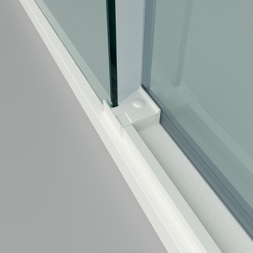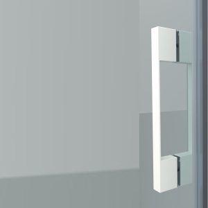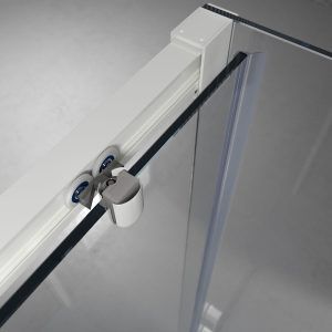 - Todo su diseño contribuye a agrandar visualmente el espacio: su perfilería en aluminio blanco mate, el tirador a juego, así como la ausencia de perfil inferior crean un efecto de cristal diáfano sin apenas particiones.