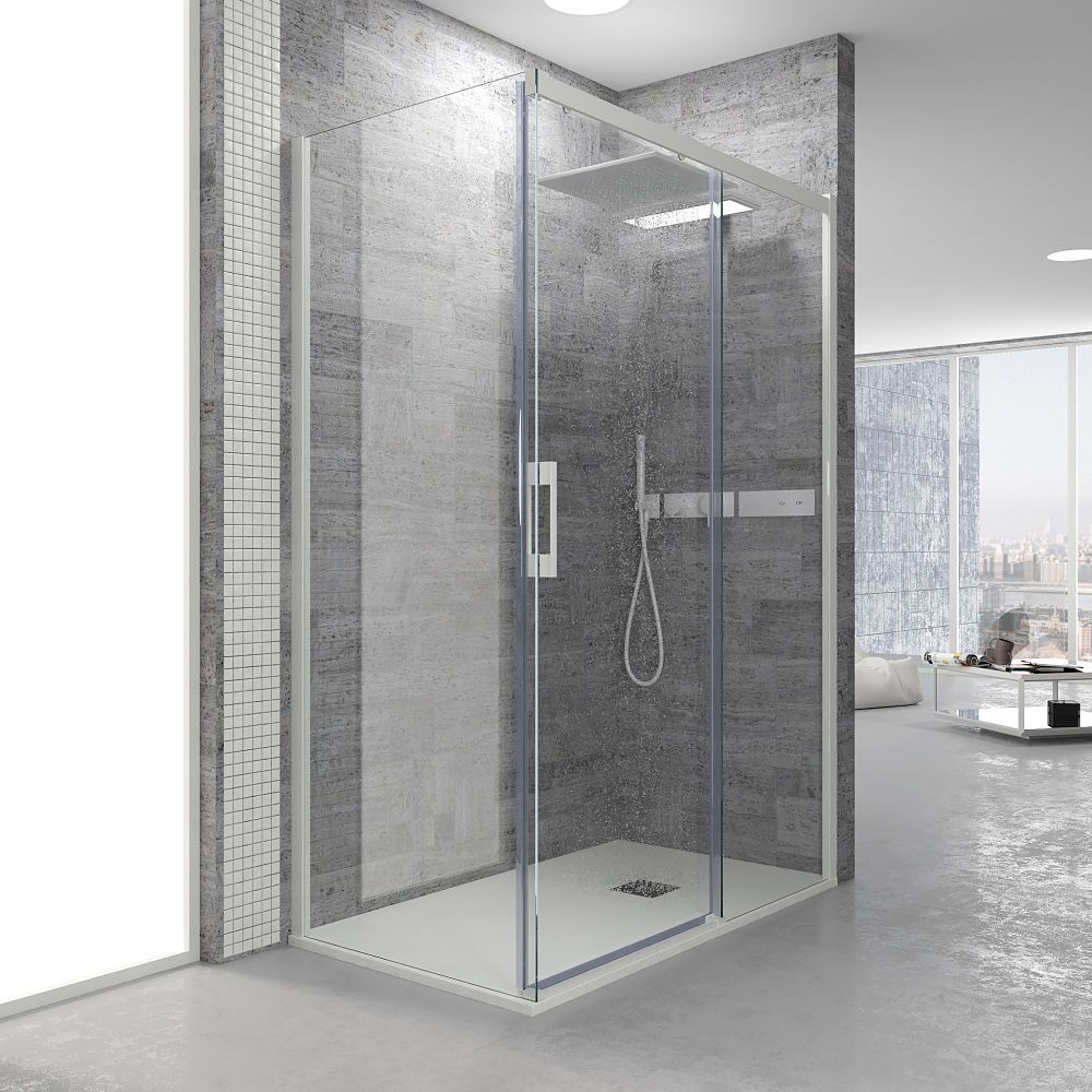 - Permite salvar obstáculos cerca del plato de ducha y ofrece una entrada óptima sin necesidad de contar con un espacio extra libre para abrir y cerrar la mampara.