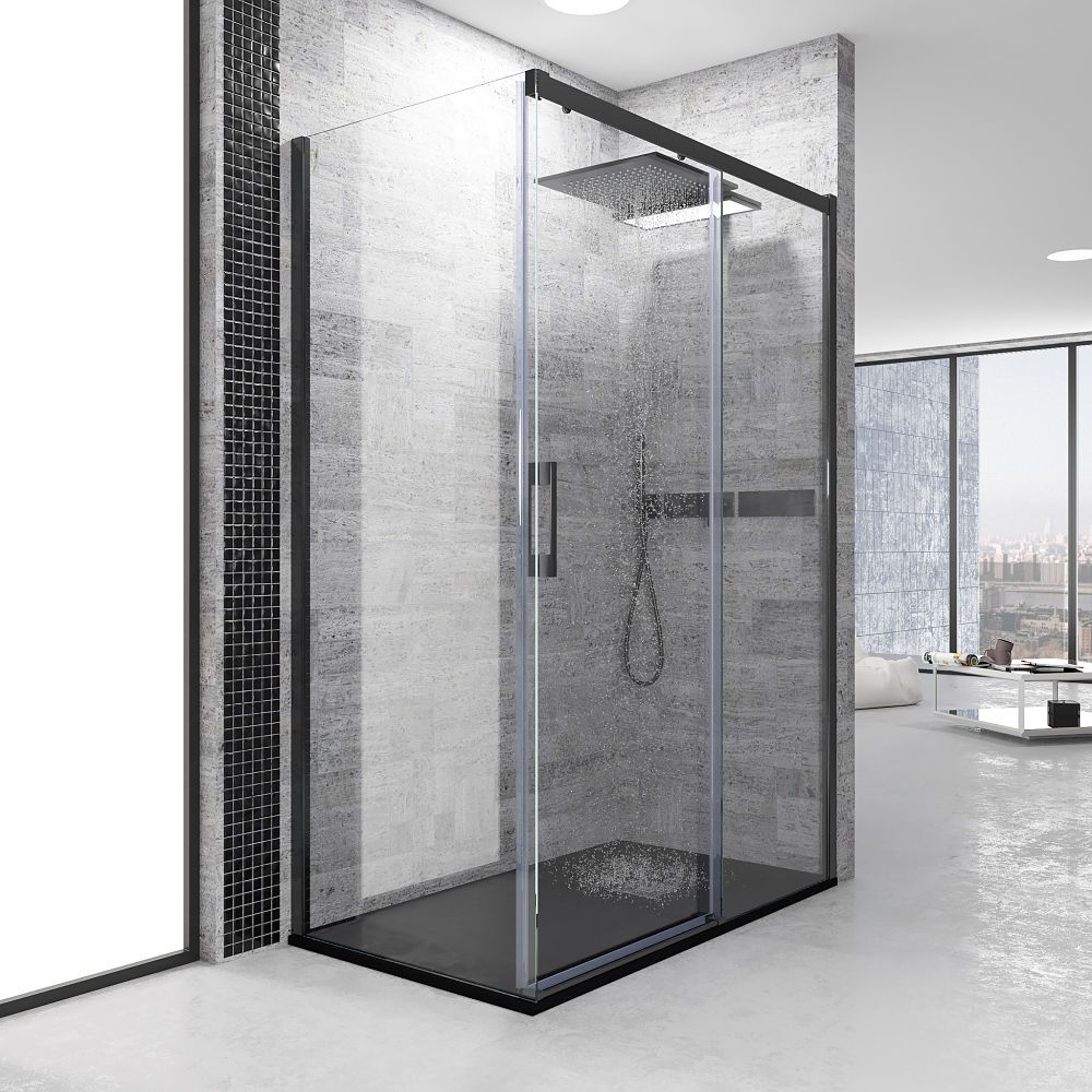• Mampara de ducha rectangular 1 fijo-1 puerta corredera + 1 fijo apertura frontal  sin perfil inferior, perfil negro mate, cristal templado 6 mm de seguridad , altura 195 cm.