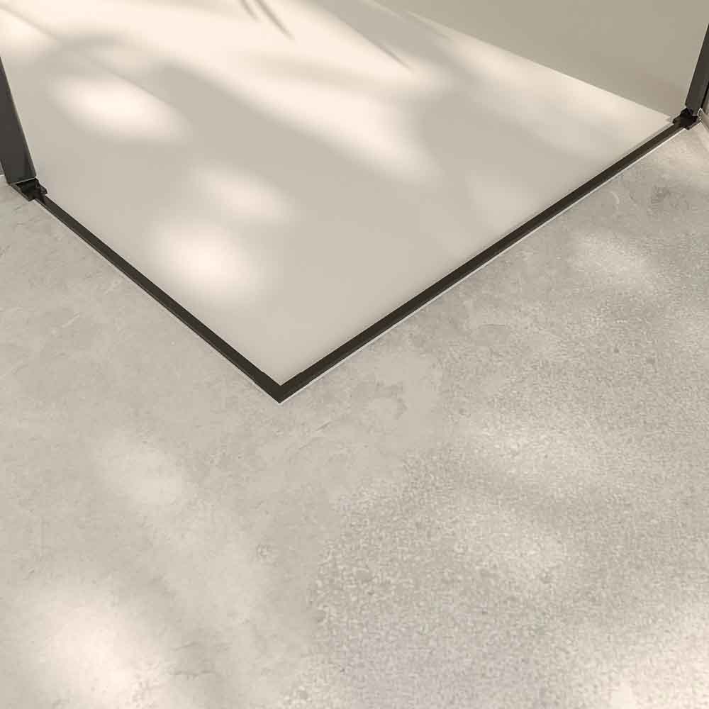 - Mampara sin perfil inferior pero con junta de goma inferior en inglete y perfil base de aluminio para mayor estanqueidad.