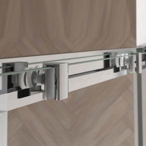 La perfilería de aluminio anodizado en acabado cromo brillo de esta mampara de ducha, el original tirador a juego, el amplio panel de cristal templado transparente en 8 mm., aumenta visualmente la estancia, especialmente si es pequeña.