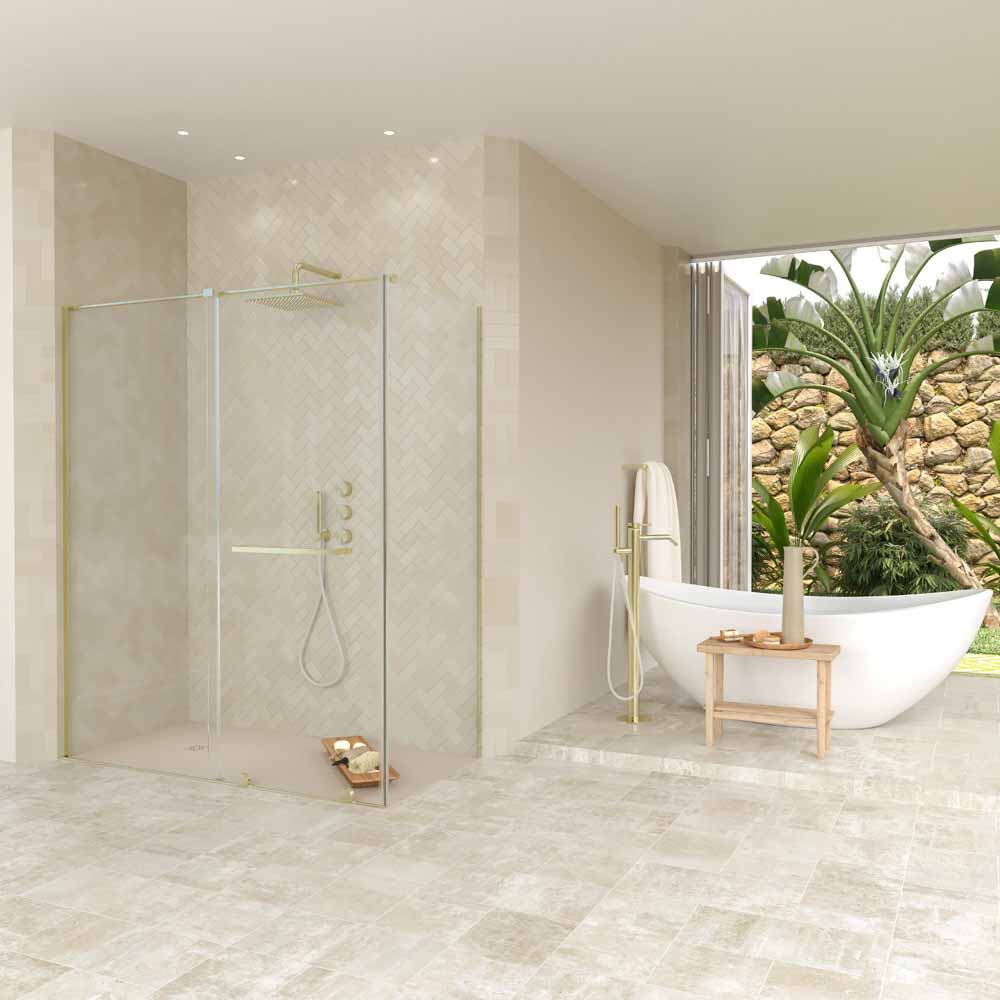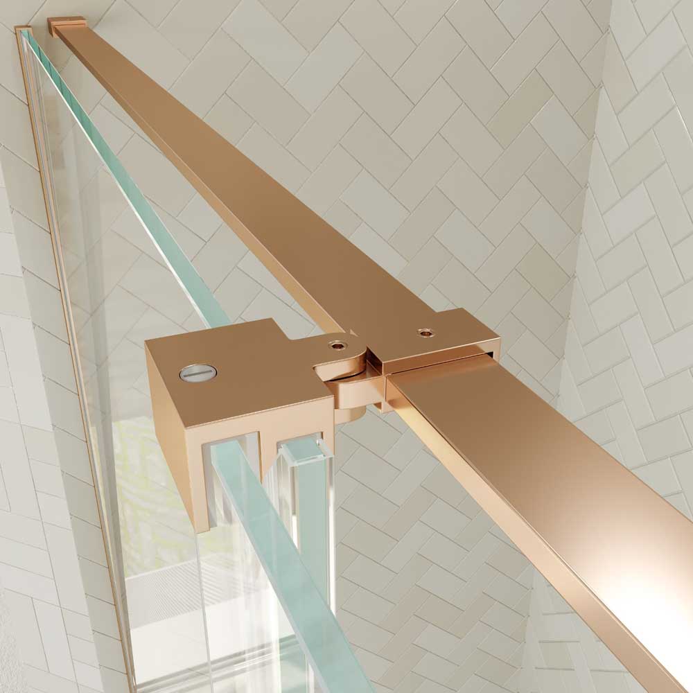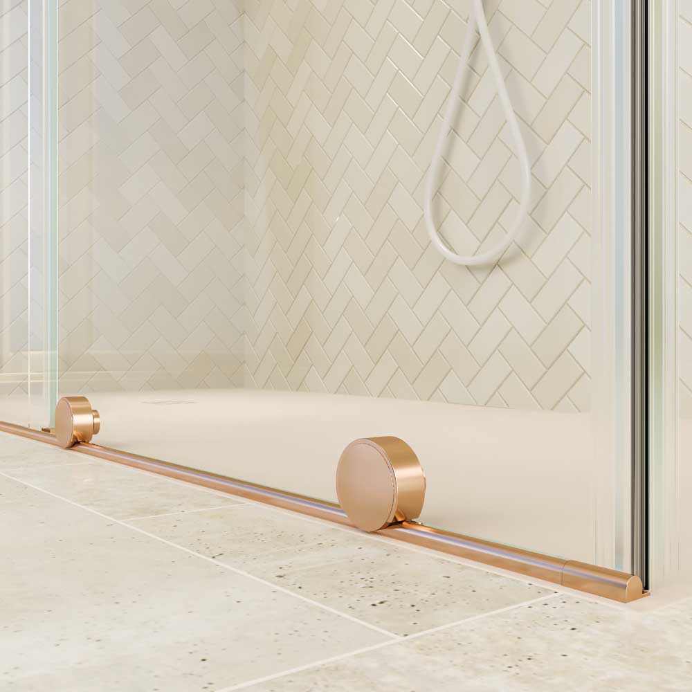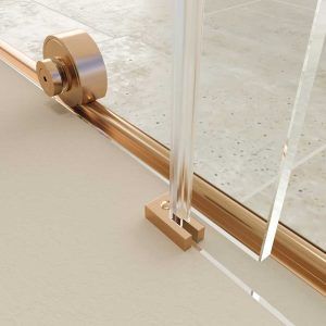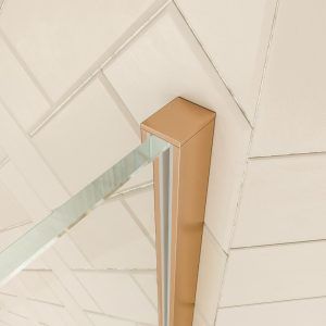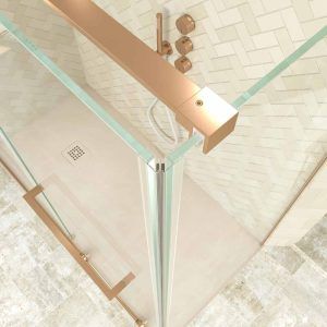 Con la mínima perfilería  en cobre mate, este frontal de ducha prescinde del perfil superior e incorpora vidrios templados de 8 mm de grosor. Solidez y resistencia en un producto que logra crear en el observador una total impresión de levedad.