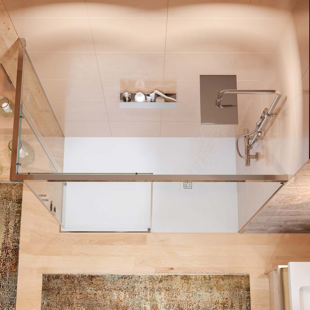 - Recomendable especialmente para platos de ducha cuyo frontal sea mayor de 120cms, para que deje un espacio de entrada mínimo de 50cms.