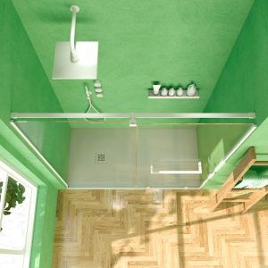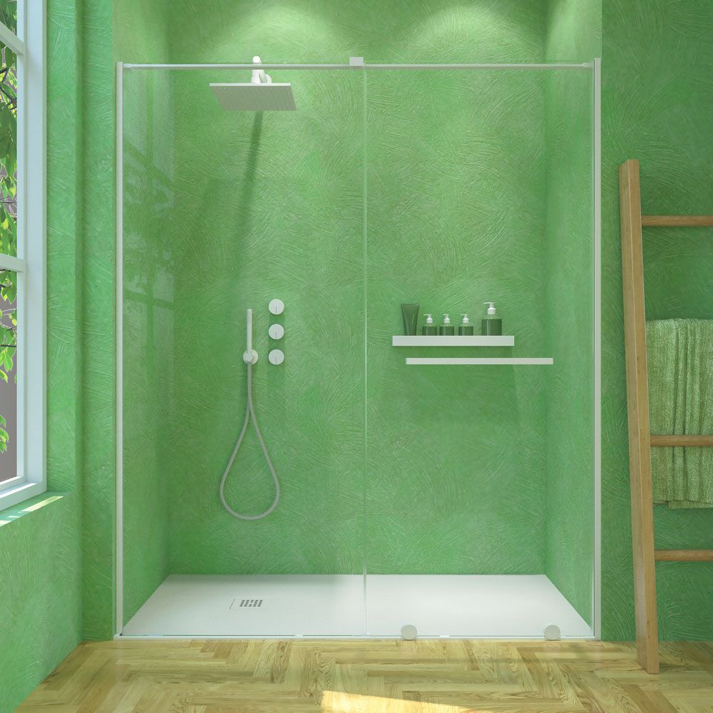 - Compuesta por una hoja fija y una corredera. La hace perfecta para colocar en baños abigarrados ya que admite obstáculos cerca de la parte fija y la puerta no necesita espacio extra para abrirse. Además, deja un amplio acceso.