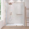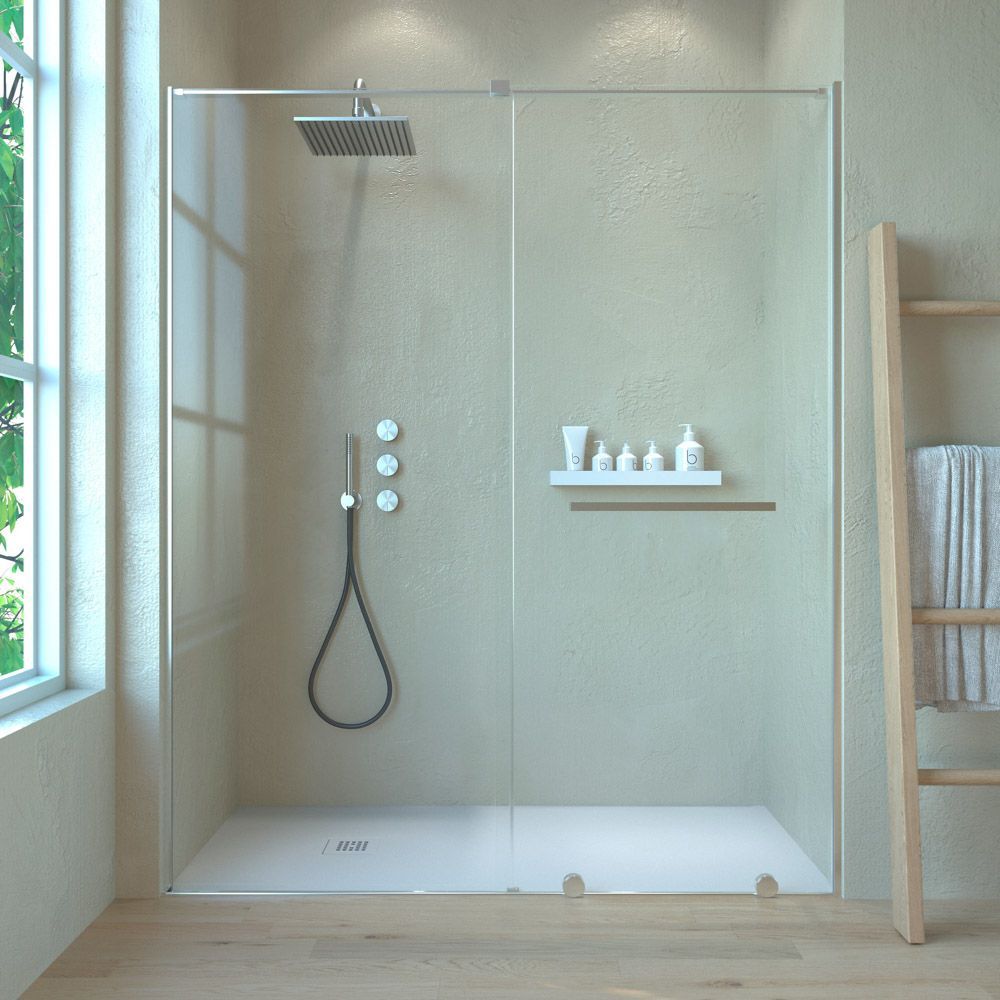 - Compuesta por una hoja fija y una corredera. La hace perfecta para colocar en baños abigarrados ya que admite obstáculos cerca de la parte fija y la puerta no necesita espacio extra para abrirse. Además, deja un amplio acceso.