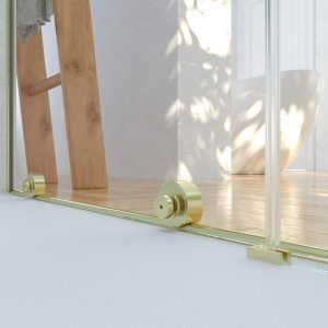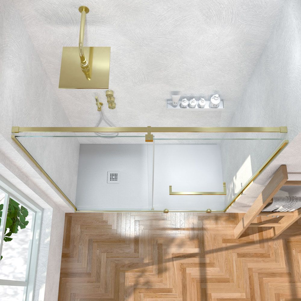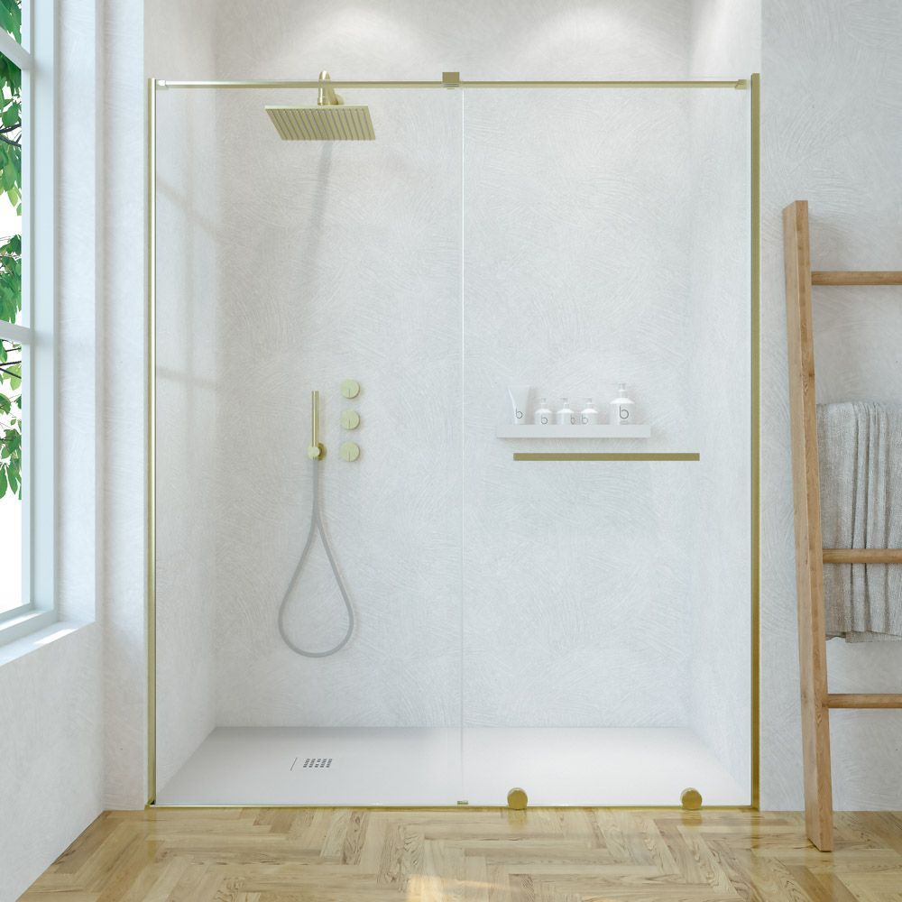 Mampara de ducha VERONA frontal 1 fijo – 1 puerta corredera sin perfil superior. Acabado ORO MATE