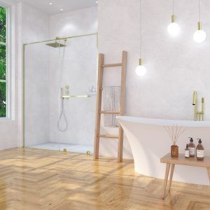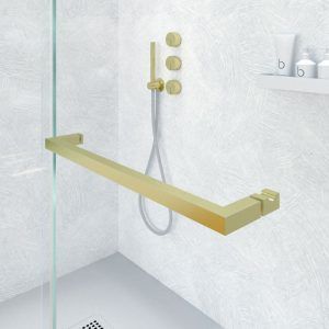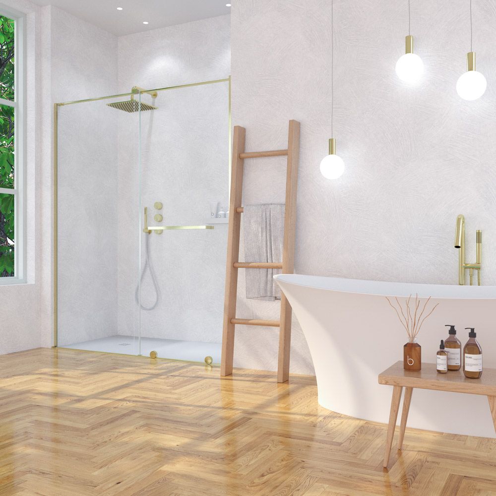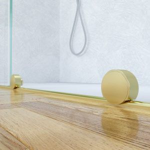 • La perfilería de acero inoxidable en oro mate contribuye a mejorar una mampara de ducha de líneas depuradas y aspecto minimalista.